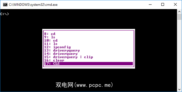 另一个选项是按 F7 ,这会在提示窗口本身内弹出一个覆盖窗口,其中列出了自打开命令提示符以来使用的所有命令。一眼就能扫描过去的命令。