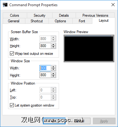 打开开始菜单,找到命令提示符 >应用,右键单击它,然后选择打开文件位置。在弹出的文件资源管理器窗口中,右键单击命令提示符快捷方式,然后选择属性。导航至布局标签,然后查看 Window Size 部分。对于宽度和高度,将值设置为 800 。下次启动命令提示符时,它将是一个最大化的窗口。