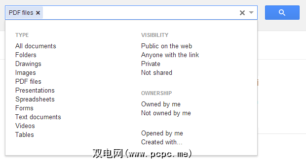 它可能不会给您一种简便的方法可以告诉您文件总数,但是Google云端硬盘秉着Google搜索的精髓,可以轻松搜索所有存储的文件。在搜索框中,单击下拉菜单图标以显示搜索参数-类型,可见性和所有权。输入搜索词组并开始搜索。