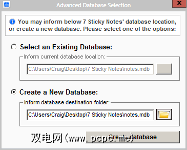 您可能还会被告知7 Sticky Notes无法找到您的数据库。第一次运行后保存文件。如果发生这种情况,只需选择创建新数据库的选项,如上面的屏幕快照中所示。