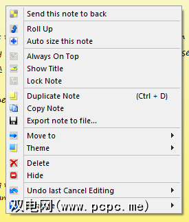 您可以看到,有很多功能每个便笺提供。您可以汇总便笺或调整便笺大小,将其设置为保留在所有其他窗口的顶部,锁定便笺,复制便笺,导出便笺,更改主题等等。请记住这一点。