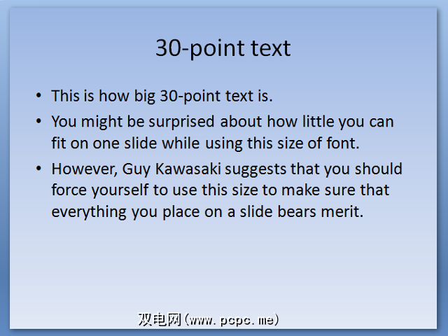 如果使用此规则,您的演示文稿看起来会不太混乱,但也会迫使您对幻灯片中包含的信息毫不留情。当您使用30点文字时,只有一定的空间可以使用,因此任何多余的文字都将很快被删除,取而代之的是有益于整个演示的内容。