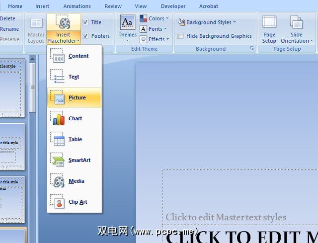 编辑“幻灯片母版",即左侧边栏顶部的幻灯片—建立设置为可通过每种不同类型的幻灯片运行的元素,例如公司徽标或背景设计。