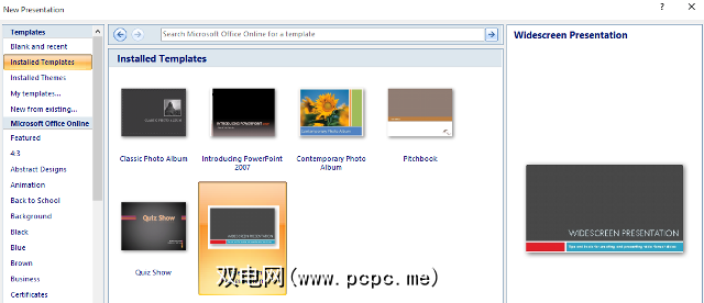 保存模板后,很容易在下一个演示文稿中使用它。点击 Office按钮,然后选择 New ,您将看到所有有权访问的模板。 Installed Templates 文件夹包含基本选择,并且 My Templates 将容纳您的创作。