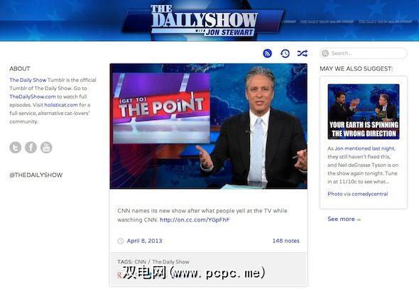 想要在晚上9点新闻和政治世界上获得更多娱乐性的人,另一个必须遵循的就是《每日秀》的官方Tumblr博客。乔恩·斯图尔特(Jon Stewart)的讽刺电视节目通过类似模因的照片将其所有精彩,讽刺的幽默带到了Tumblr,并链接到喜剧中心的相关视频。