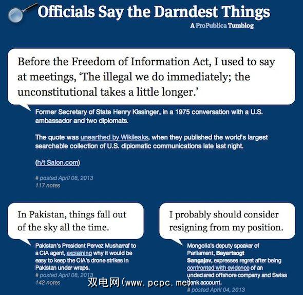 官员说“最危险的事情",由新闻调查机构ProPublica经营的tumblr博客,以最幽默的方式展现了美国政治世界的迷人魅力。该政治博客收集了来自美国政客,领导人和开拓者的引语,推文和更多有趣的内容,引人深思。