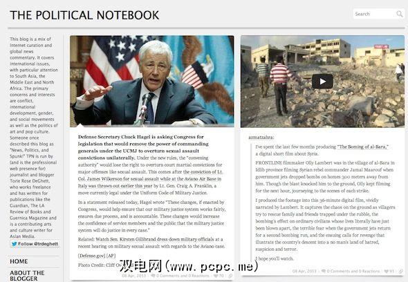 用他们自己的话说,政治笔记本是“互联网策展和全球新闻评论的结合。它涵盖了国际问题,尤其是对南亚,中东和北非的关注。"该博客是令人印象深刻的新闻链接,视频和更多内容的集合。博客策展人不仅推荐阅读各种国际新闻报道,而且还每周提供有关安全和军事事务的每周新闻综述。