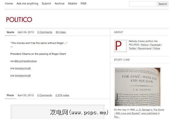 带有Politico的标语,“ 没人"我们知道像Politico'这样的政治,因此不将他们的Tumblr博客列入政治必读清单中,将是我们的失职。结合照片,推文,报价,新闻故事,链接等内容,这是一种获取最新新闻信息的好方法,同时又侧重于美国政治以及偶尔有国际关注的帖子