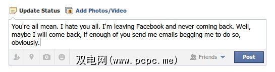 永远离开Facebook并没有什么错,宣布您已经经历了足够的争吵和BS,并且正在删除您的帐户。但是,不要告诉所有人,只有在一些人说服您这样做之后,您才离开网站。