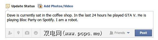 他们的Facebook feed包含除了自动状态更新外,什么都没有。也许告诉全世界他们现在所处的位置,他们刚刚玩过什么游戏,刚刚听过的歌曲或刚刚看过的电视节目。我不在乎这些东西,罗伯托先生,那你为什么要告诉我?!
