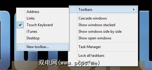 右键单击Windows任务栏,从工具栏中选择 Toolbars 。菜单,然后选择现有的工具栏,或单击新工具栏... 。添加新工具栏时,需要在计算机上选择一个包含所需内容的文件夹。您可以在选择位置时创建一个新文件夹,以后再添加内容。