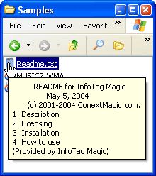当您将鼠标悬停在项目上时,它将显示有关MP3,Ogg Vorbis等的信息。对于EXE和DLL文件等,它显示版本信息。此外,当您将鼠标悬停在文本提示上时,它将继续在工具提示中显示文本文件的预览。