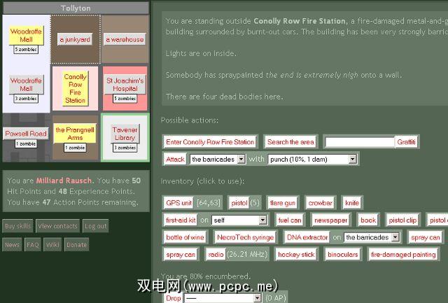 您知道那里吗是基于文本的MMO? Urban Dead 是引人入胜的流派的好方法;您将以人类的身份开始,并且需要在僵尸攻击中幸存下来。如果您被杀死,除非有人能治愈您,否则您将以僵尸的身份回来。探索城市,找到有用的物品,并尽可能长寿。而且,别忘了即使注销也可以将您杀死,因此请务必在一天之内找到一个安全的地方(否则您的行动要点已耗尽)!