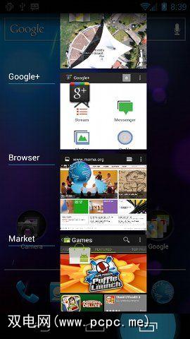 在Android 4.0中不再如此。使用最新使用的应用程序的缩略图视图,可以在装有操作系统的所有设备上执行多任务处理。应用之间的切换现在应该更快一点并且更具吸引力。