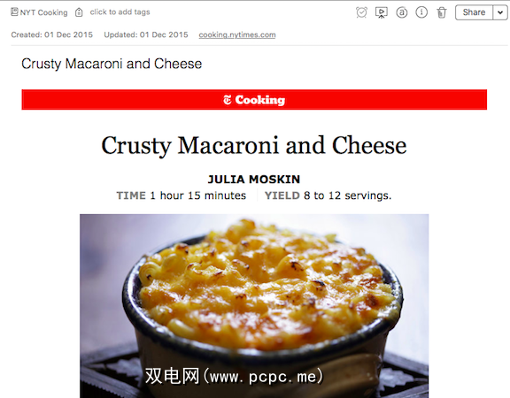 现在,Evernote与Times携手合作,使您可以将食谱保存到您的帐户中。当您在食谱中看到自己喜欢的东西时,只需单击“保存"按钮。这会将其保存到您的NYT帐户中,但同时还会将副本发送到您的Evernote帐户中。没有标签,但是,那只是个小问题。