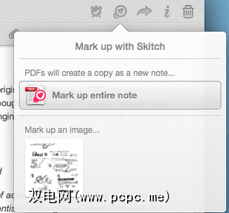 Evernote早在2011年就收购了图像编辑器Skitch,现在已将其与Evernote集成到Mac和iOS中版本,允许用户打开笔记并在外部应用程序中对其进行标记。实际上,Evernote会为选定的便笺制作PDF副本,这样您的原始便会保持原样。