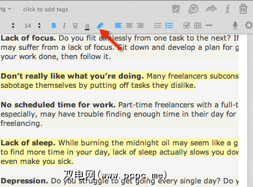 要使用它,请选择一些文本,然后单击位于格式样式工具旁边的突出显示按钮。我已将键盘快捷键(格式>样式>高亮)映射到BetterTouchTool,以便可以激活荧光笔,而不必将手指从触控板上移开。荧光笔仅在Mac版的Evernote中可用。