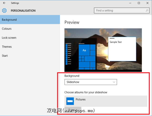 要启用幻灯片显示功能,请转到开始>设置>个性化>背景,然后从下拉菜单中选择幻灯片。将提示您选择要使用的文件夹(提示:您可以选择一个OneDrive文件夹),以及更改图像的频率。