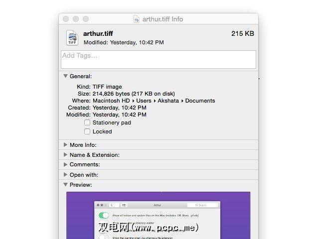 文件和文件夹信息弹出窗口的方法非常详细,为您提供各种信息-从磁盘上的文件大小到共享权限。您可以在此弹出窗口中进行各种更改:您可以共享文件,锁定文件,预览文件,隐藏扩展名以及向其中添加标签。