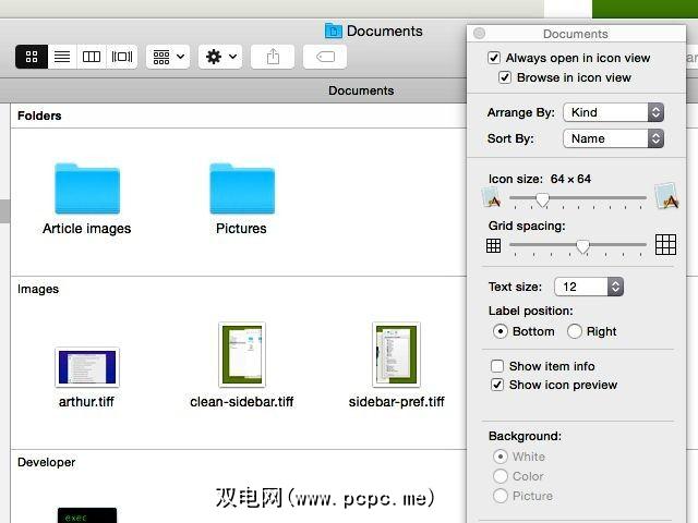 在弹出的框中,您可以缩放文件并文件夹图标,移动其标签,并更改其网格间距。您甚至可以用漂亮的颜色或图像增亮背景。查找排列方式和排序方式选项,以按修改日期,文件类型,标签等清理文件夹视图。