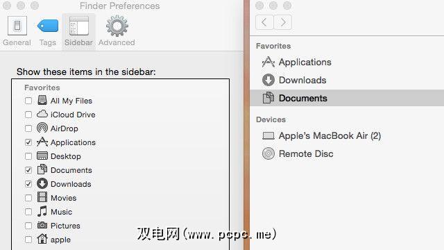 下面的屏幕截图显示了我的Finder侧边栏首选项(左)以及清理后的侧边栏在Mac上的显示方式(右)。