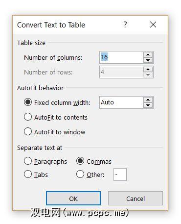 Microsoft Word通过考虑文本分隔符来确定所需的行数和列数,然后自动调整内容。 将文本转换为表格对话框可让您更好地控制先前的操作是否正确。您还可以选择如何适合页面上表格的内容。