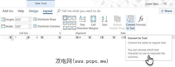 转到功能区>表格工具>布局>,在数据组中,点击转换为文本。