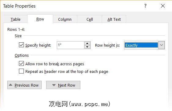 第一步是为单元格指定固定大小。转到表格属性>行>,在指定高度框中输入一个值。对于行高,请从下拉列表中选择完全。