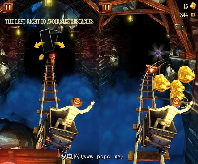 此处的设置与Temple Run 2的防雷等级没有太大不同-您是放在铁轨上的推车上,您需要收集尽可能多的金,同时避开障碍物并在铁轨之间跳跃。慢慢开始(带有教程),游戏会随着您深入地雷而加速,并要求您越走越快。