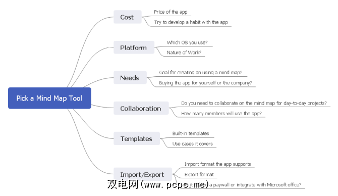 选择思维导图软件在很大程度上取决于您的需求。市场上有如此多的应用程序,这并非易事。思维导图上显示的这些因素将帮助您确定