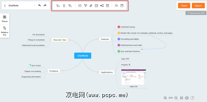 选择插入子节点以创建子分支。然后点击关系行以显示特定想法之间的关系。您可以将完成的思维导图导出为文本,PNG,JPEG,PDF或SVG。