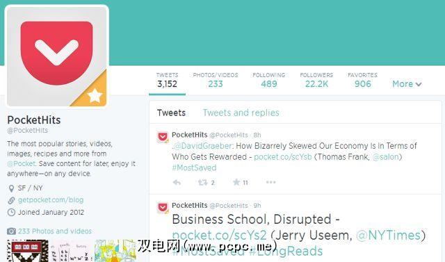 Pocket是数百万的终极数字书签服务的用户,就像可读性一样,他们利用读者正在检查的内容来整理您应点击的内容。不过,有两件事是不同的。首先,PocketHits仅可作为Twitter帐户使用。其次,它不仅限于文章,因此您也可以在上面找到视频和相册。不过,它主要是关于文章的,您会在这里找到一些不错的阅读材料。如果您需要浏览档案,则唯一的希望就是年度Pocket Hits Awards页面。