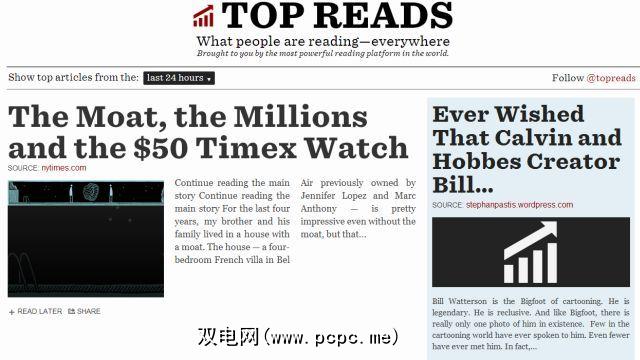 很多人使用Readability应用程序剥离网页中不必要的元素,然后阅读主要文章或将其保存以备后用。可读性已使用这些数据制作了一个“热门阅读"部分,向您显示人们正在使用该应用程序的链接-当很多人在同一链接上使用它时,这是一个值得阅读的链接!您只能按最后一小时,一天或一周的顺序对列表进行排序,因此这不是您要浏览档案的网站。但是有了“最后一小时"功能,它是掌握人们现在正在阅读的内容的好方法。