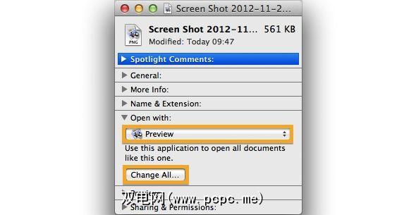 或者,右键单击文件,然后选择获取信息,或按Command + I启动上面的屏幕快照中显示的信息面板。在这里,您可以选择应用程序以打开此类文件。按下面的全部更改按钮以在系统范围内应用更改。