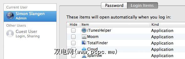 您是否为应用程序在启动过程中无提示启动感到烦恼?打开系统偏好设置,然后转到用户和组偏好设置窗格。从左侧列中选择您的帐户,然后转到登录项。这里列出了所有设置为登录到计算机后启动的应用程序。