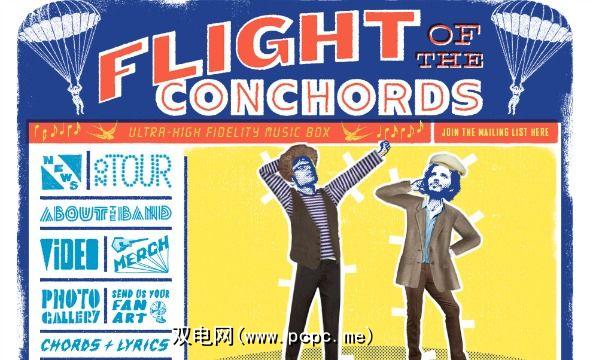 Conchords是来自新西兰的二人组,成员包括Bret McKenzie和Jemaine Clement。他们主要是一个喜剧性的民间团体,但是由于HBO上的热门节目,他们比这个绰号所暗示的要成功得多。该网站具有复古的感觉,其风格和幽默感可以完美配合乐队。
