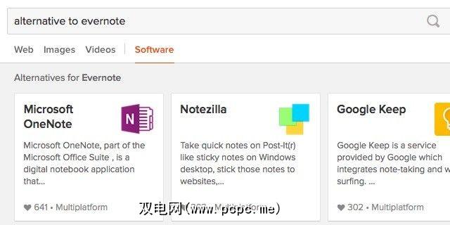 如果您要寻找Evernote的替代品,查找替代品的最快方法是通过网页搜索或通过AlternativeTo(众包平台推荐应用)。您可以在DuckDuckGo中结合两者的功能,如下所示:搜索 evernote的替代版本。这使您可以从DuckDuckGo中的AlternativeTo中获得类似Evernote替代品的卡片视图。