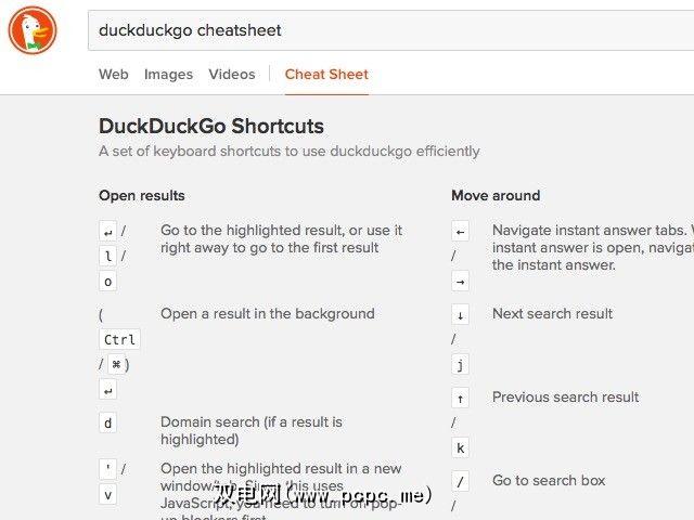 如果您键入知名应用程序或操作系统的名称,然后键入 cheatsheet (然后按输入,当然),您将在DuckDuckGo中找到相关的备忘单。