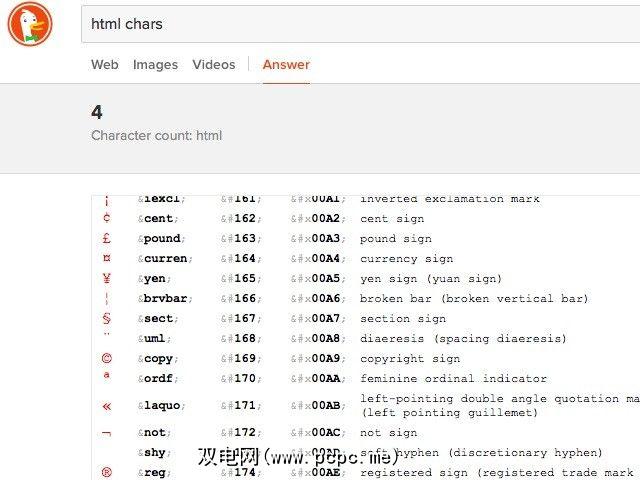 在DuckDuckGo中查找 html字符,您将获得各种HTML代码的列表(以及十进制和十六进制代码)特殊的角色。复制此部分中的正确代码比访问单独的网站来复制它们更容易,不是吗?