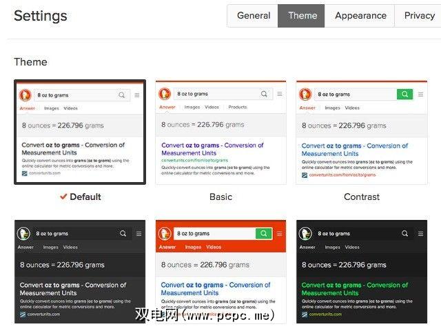 您不能更改Google搜索的外观(除非您将其添加为网站上的搜索引擎),但是您可以自定义DuckDuckGo的外观。进入设置>外观即可实现。如果您不想摆弄字体和颜色代码之类的东西,请从设置>主题中选择一个预设主题。