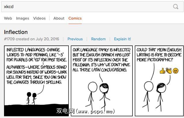 在DuckDuckGo中查找 xkcd ,您将在搜索结果上方找到最新的XKCD面板。不要错过上一个,下一个,随机和说明!链接,以挖掘更多的面板而无需