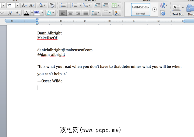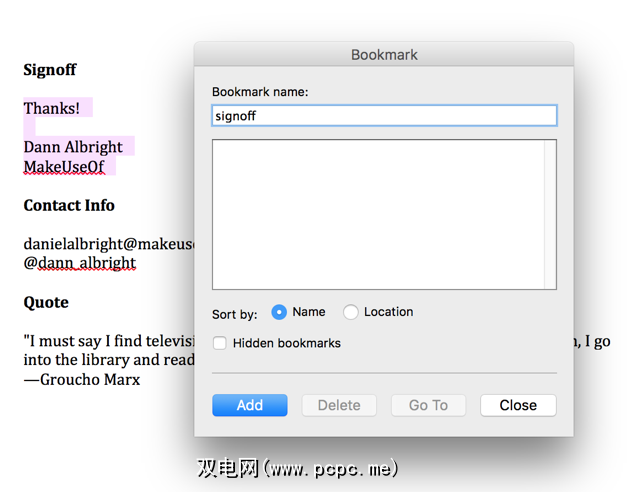 要对所有您链接到书签的文档,返回到普通文本文件,然后进行更改。在这里,我用Oscar Wilde的一句代替了Groucho Marx的报价。