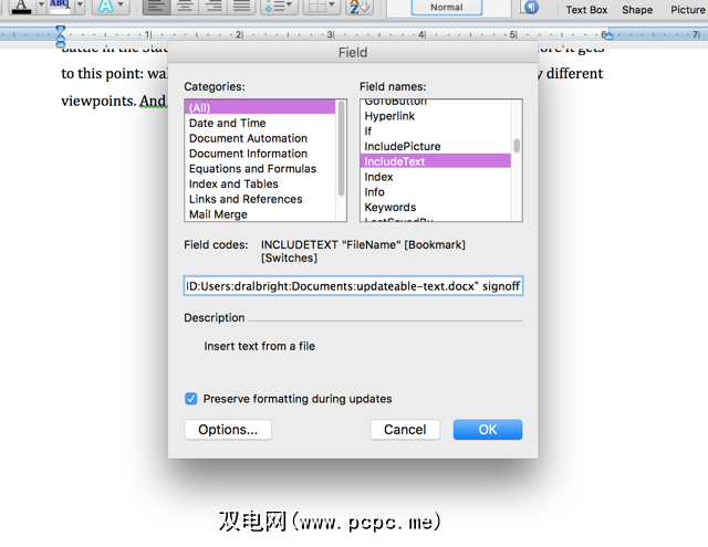 现在,保存文件并记下保存文件的完整路径。要插入保存的文本,请转到另一个Microsoft Word文档并点击插入>字段。从字段名称菜单中选择 IncludeText 。