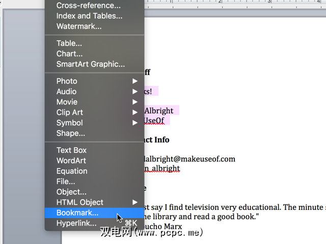 我要在每个字母中包括这些内容(包括签字,联系方式和引号)。为此,我将在每个书签上创建一个书签。要创建书签,请突出显示要在其他文档中链接的文本,然后单击插入>书签。