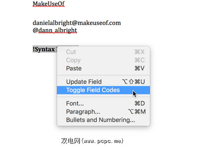 要解决此问题,请在错误的任意位置上单击鼠标右键,然后选择切换域代码 > —这将使您可以从文档内部查看和编辑代码。如果需要进行更改,也可以在正常工作的字段上使用它。