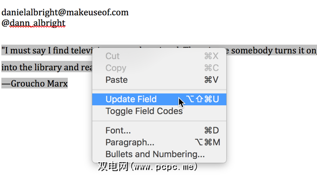 在您的其他文档中,右键单击已更新的字段,然后选择 Update Field >。