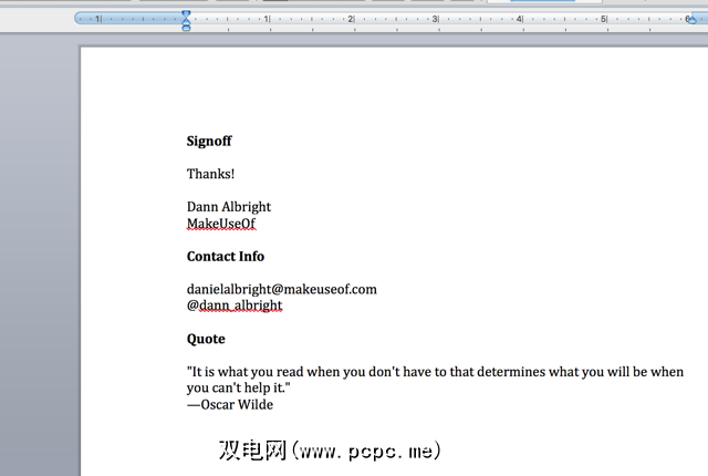 假设您有一堆要发送的所有套用信函。包括您的姓名和您工作的公司,但您的雇主会定期更换。您不想在每次签订新合同时都更改每个字母,因此您可以将签名存储在一个文档中,而其他所有更改都在您进行更改时进行更新。