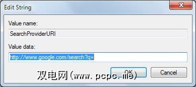 下一步,我们必须指定URL。单击新建>字符串值,并将其命名为 SearchProviderURI (大写 i , not URL )。在框中输入以下URL,然后单击确定。