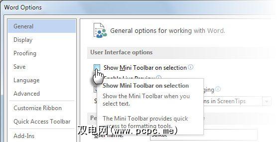 在用户界面选项下>下,取消选中在选择时显示迷你工具栏 。单击确定。