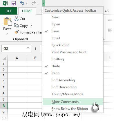 点击更多命令以转到 Excel选项和“快速访问工具栏"标签。